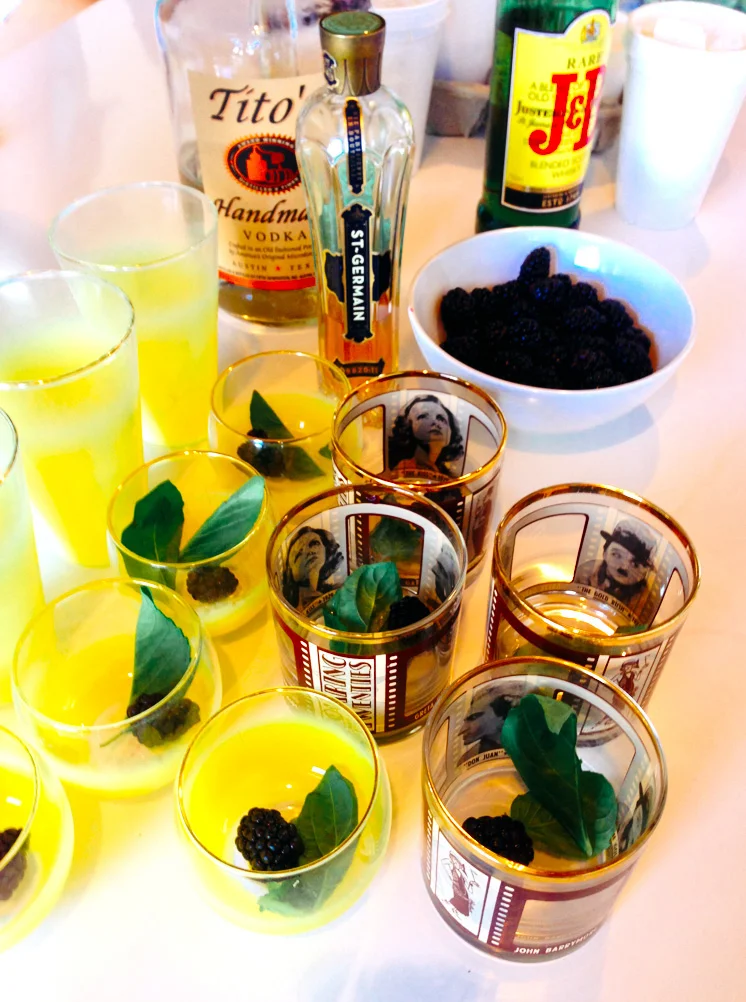 - To serve, line glasses with 1 basil leaf and a single blackberry ahead of time.